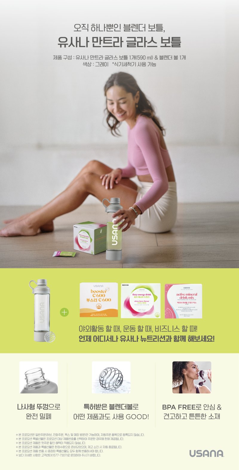 스타일리시한 유사나 글라스 보틀까지 함께 제공돼요. 이 보틀은 BPA FREE는 물론, 특허받은 블렌더볼이 들어 있어 쉐이크 음료나 프로틴 섭취용으로도 최고예요.