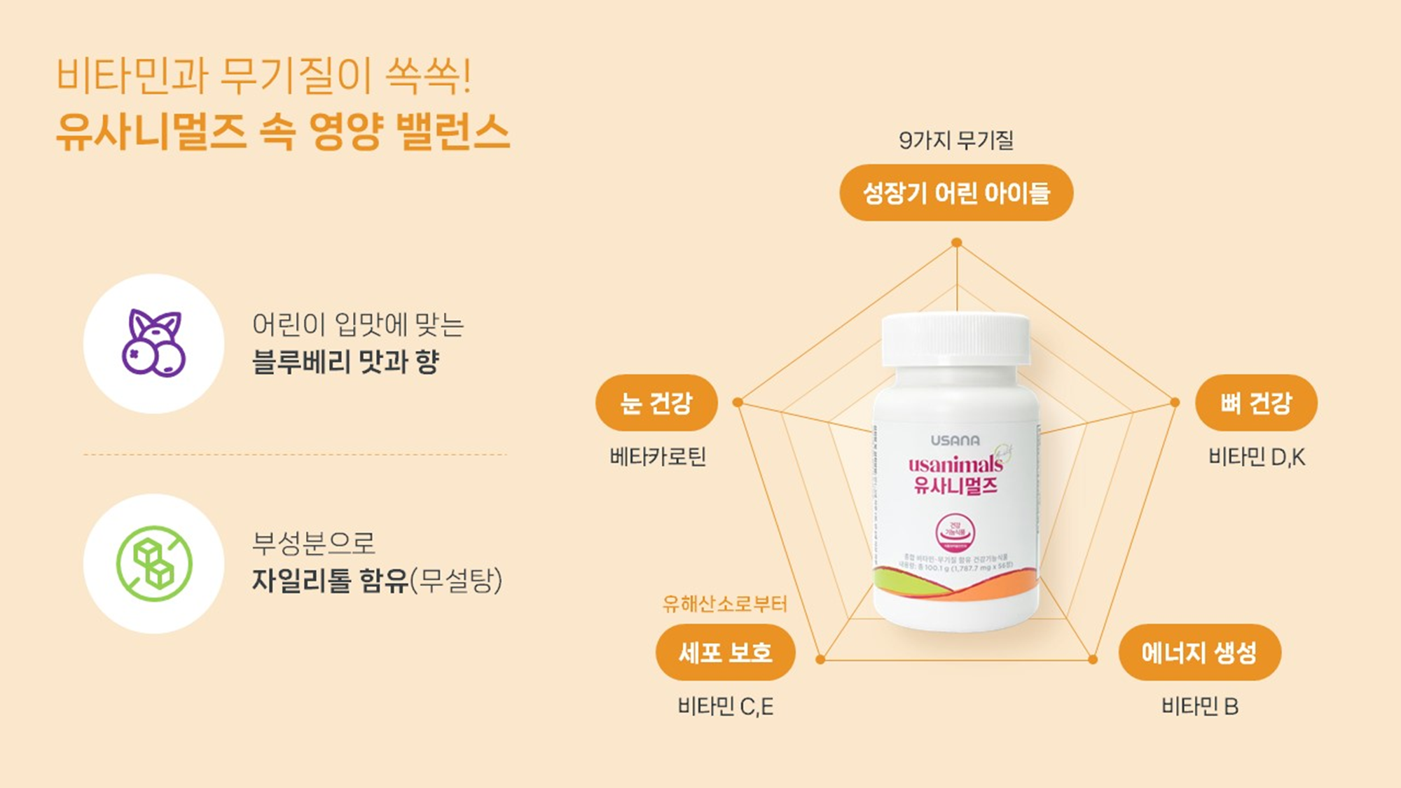 유사니멀즈(Usanimals)는 유사나(USANA) + 애니멀즈(Animals)의 합성어로, 어린이 건강을 위해 만든 종합 멀티비타민이에요!