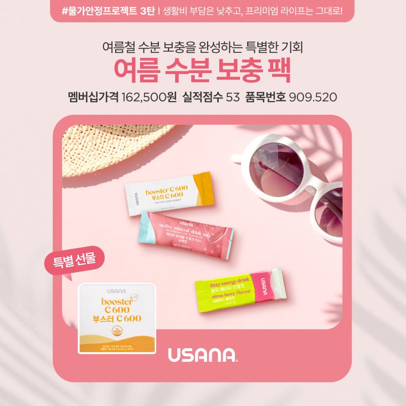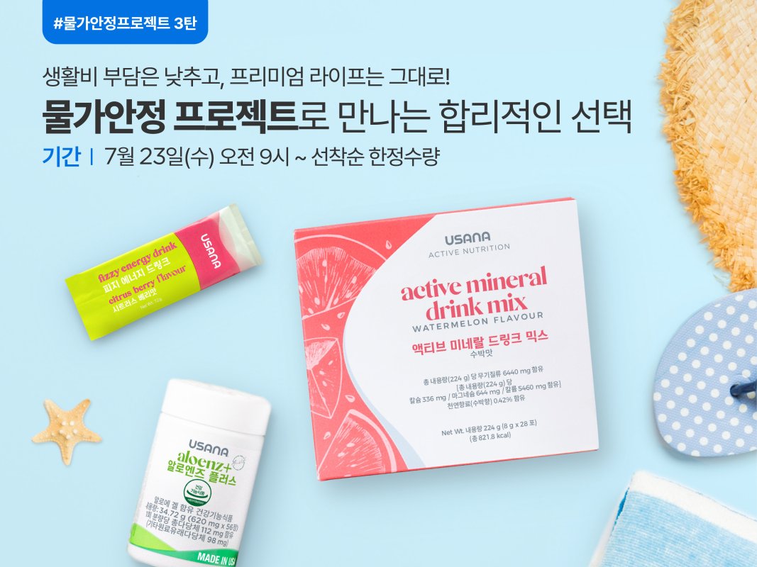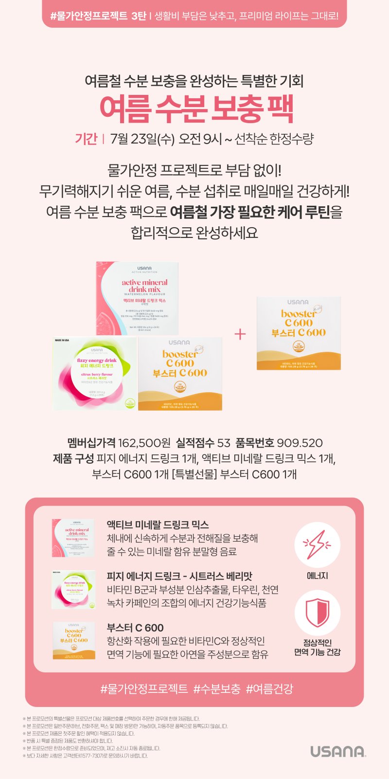 ‘물가안정 프로젝트’는 유사나가 물가 상승으로 인해 건강 제품을 구매하기 어려운 소비자들을 위해 기획한 특별한 혜택 프로그램입니다. 특히 이번 3탄은 여름철 건강 관리에 초점을 맞추어, 수분 보충과 면역력 강화라는 두 가지 핵심 루틴에 필요한 제품들로 구성되어 있습니다.