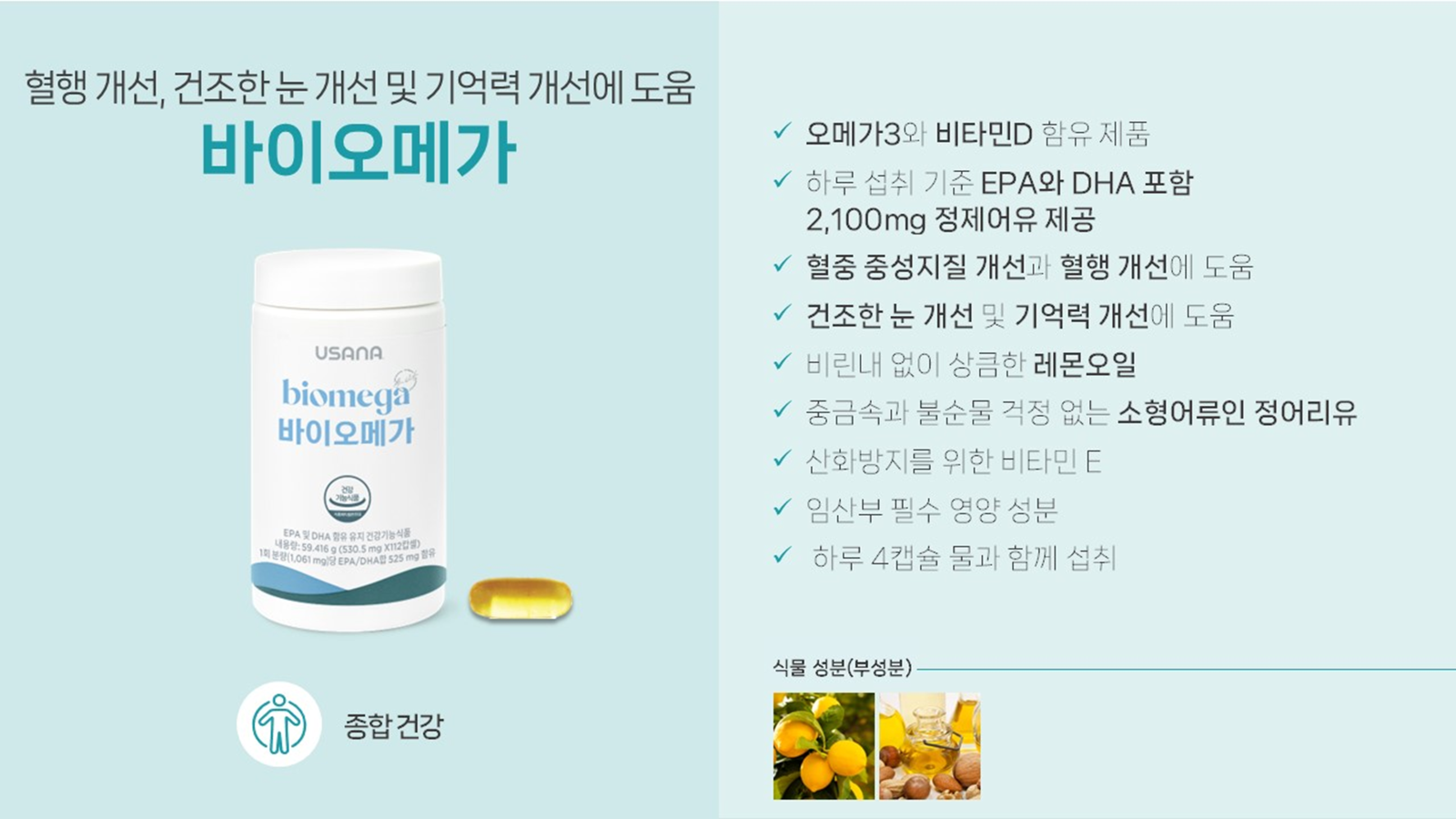 오메가3는 혈행 건강을 위해 꼭 필요한 필수 영양소입니다. 깨끗한 원료와 과학적인 제조 공정을 거친 유사나 바이오메가로 건강한 몸을 유지하세요! 🌿