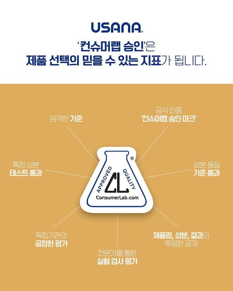컨슈머랩은 건강기능식품 및 영양제에 대해 브랜드나 제조사의 지원 없이 독립적으로 구성된 미국의 평가기관입니다. 제품에 표시된 성분이 실제로 포함되어 있는지, 함량이 적절한지, 불순물이나 중금속이 없는지 등을 실험실에서 직접 분석하여 평가하고, 엄격한 테스트를 통과한 제품에만 ‘Approved Quality’ 마크를 부여합니다.