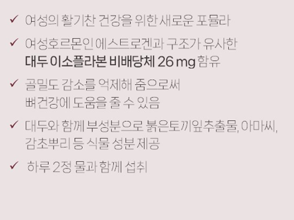 - ✔ 대두 이소플라본 26 mg — 핵심 에스트로겐 보완 성분