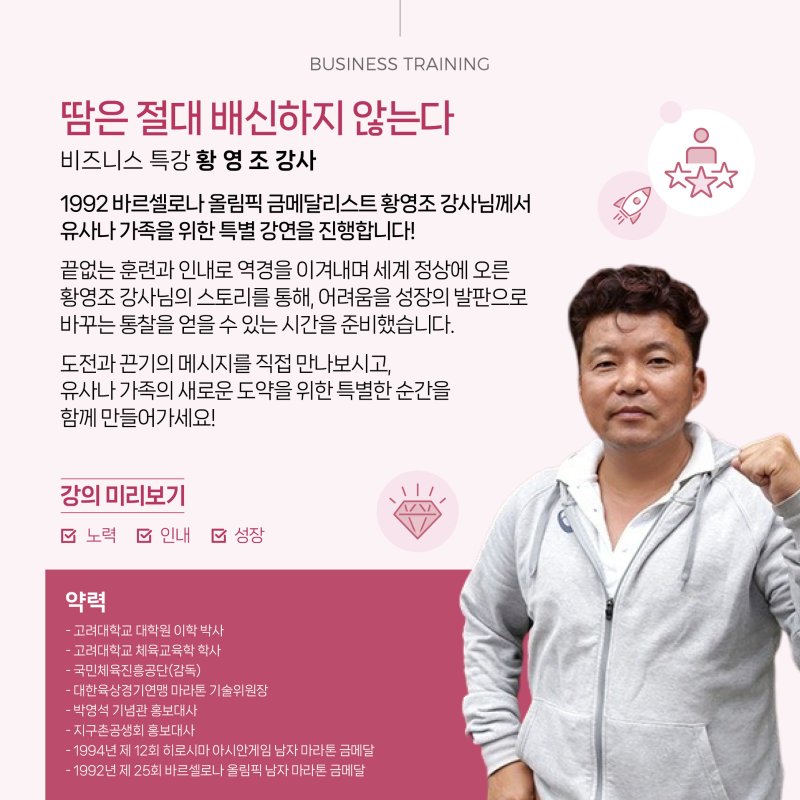 바르셀로나 올림픽 금메달리스트 황영조 강사가 “땀은 절대 배신하지 않는다”라는 주제로 비즈니스 트레이닝을 진행해요.