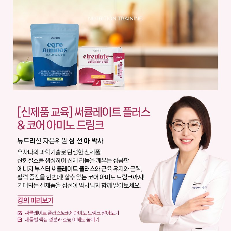 제품 교육은 뉴트리션 자문위원 심선아 박사님이 맡아, 신체 활력과 운동 효율을 높이는 기능을 과학적으로 설명해 주실꺼에요.