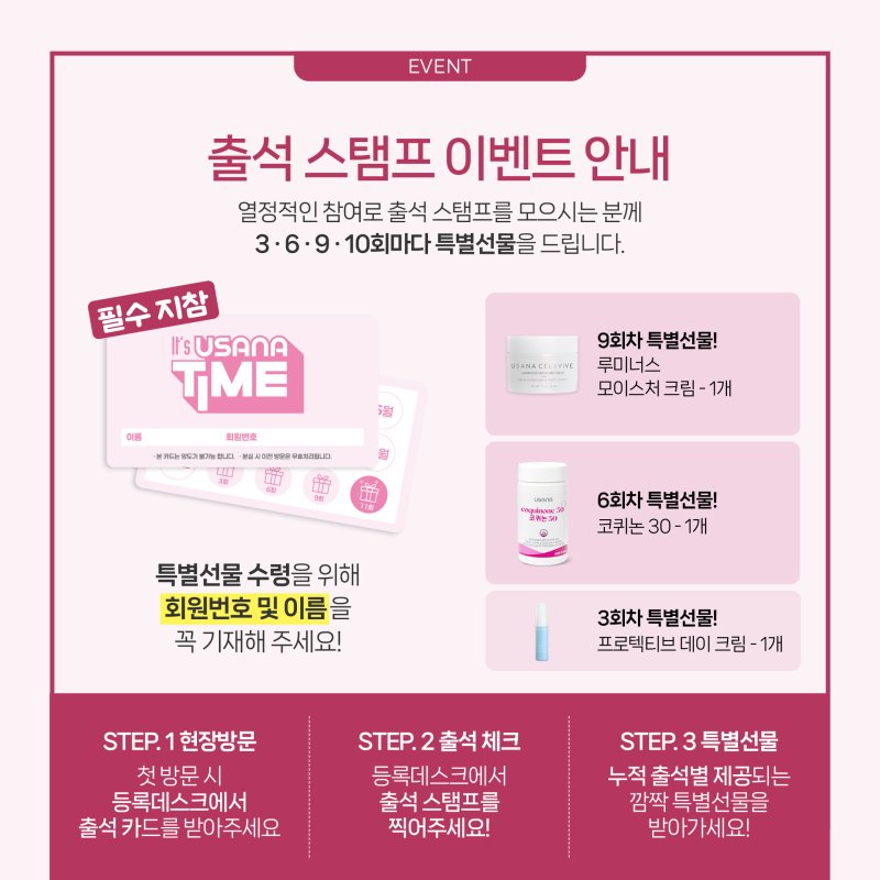 3회, 6회, 9회, 10회 참석 시 각기 다른 선물이 증정되며, 출석 카드는 등록 데스크에서 필수로 수령해야해요.