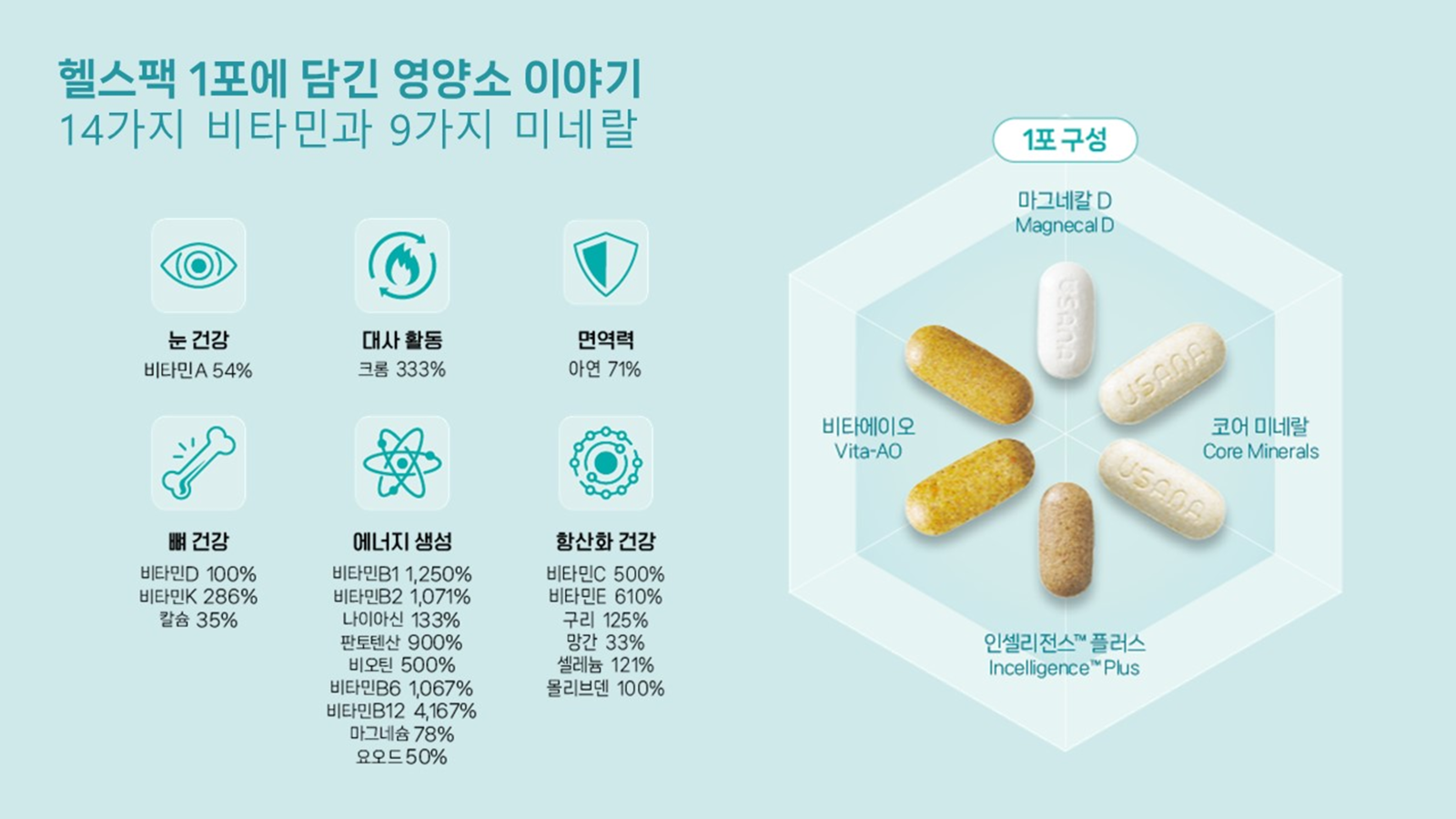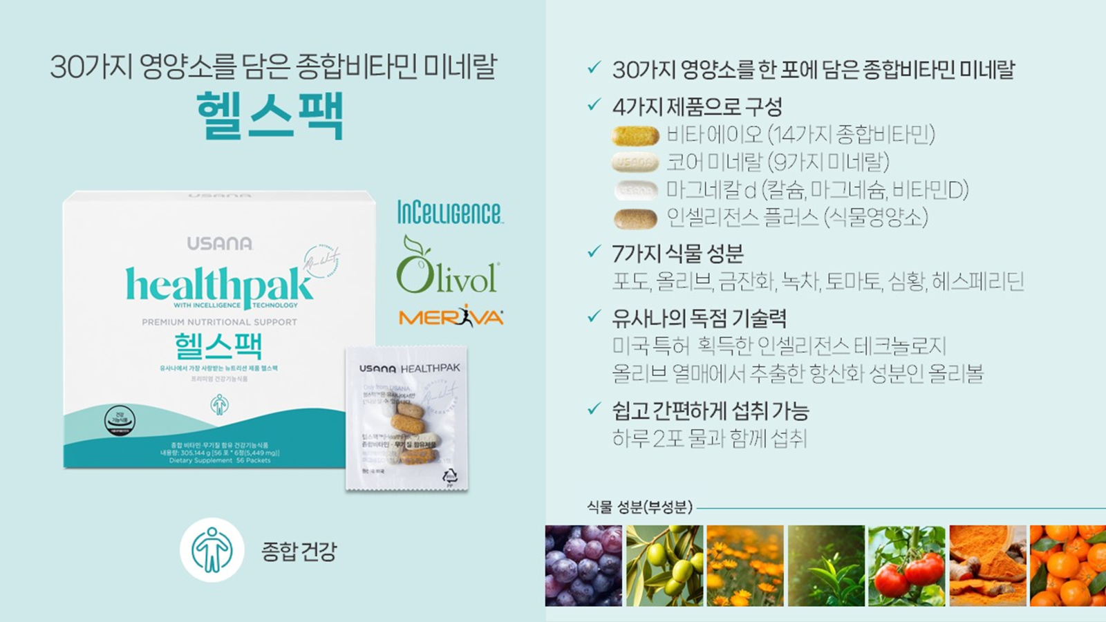👉 유사나 헬스팩은 체내에서 잘 흡수되는 30가지 비타민, 미네랄, 식물성 원료를 배합하여, 매일 간편하게 섭취할 수 있는 맞춤형 건강 솔루션입니다.